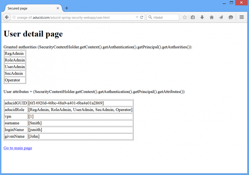 User detail page shows example how to access user attributes tied to cyber identity. It contains jstl + scriptlets to get these information from authenticated AducidAuthenticationToken object stored in SecurityContextHolder.