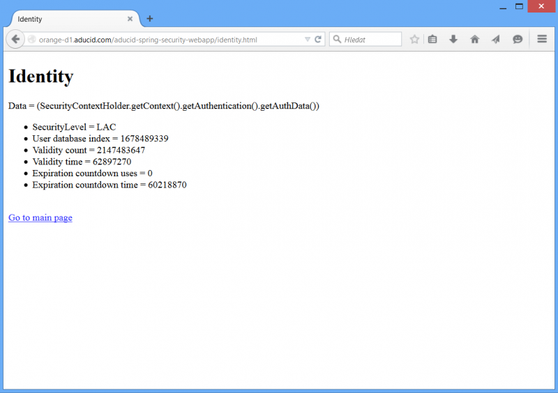 Identity page shows example how to get cyber identity attributes, when you have logged in with ADUCID. It contains jstl + scriptlets to get these information from authenticated AducidAuthenticationToken object stored in SecurityContextHolder.