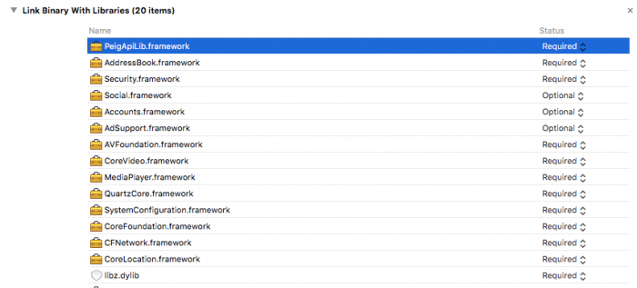 Framework PeigApiLib.framework must be included into Xcode project, in project settings, choose Build Phases, section Link Binary With Libraries, see below image.